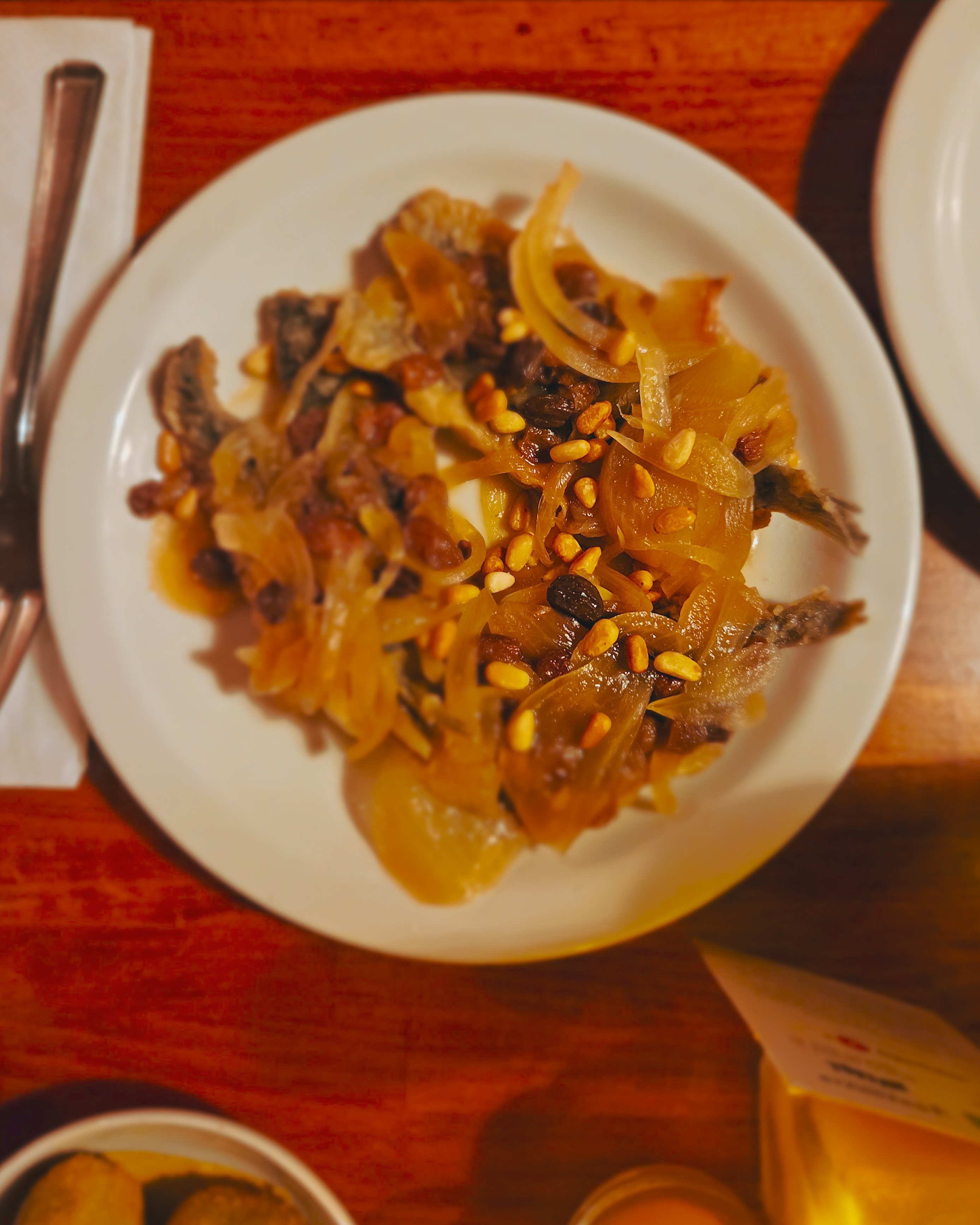 Try the Sarde in saor – fried sardines marinated in a sweet and sour sauce with onions, vinegar, raisins, and pine nuts. Over the centuries, this dish has evolved from a simple preservation technique for Venetian fishermen and sailors who needed to keep fish edible during long sea voyages before the invention of refrigeration into a refined dish. The addition of raisins and pine nuts, reflecting Venice’s history as a major trading hub with the East, balances the sharpness of the vinegar, creating the distinctive sweet and sour flavour.